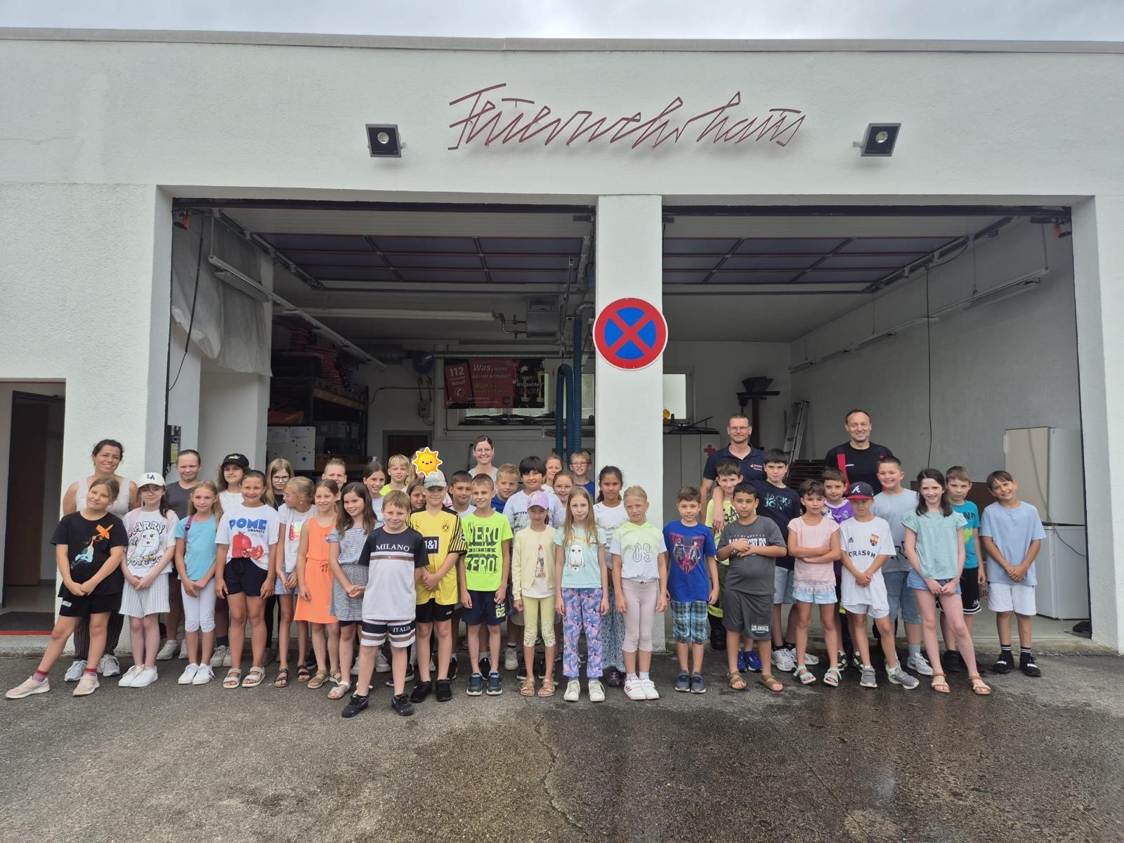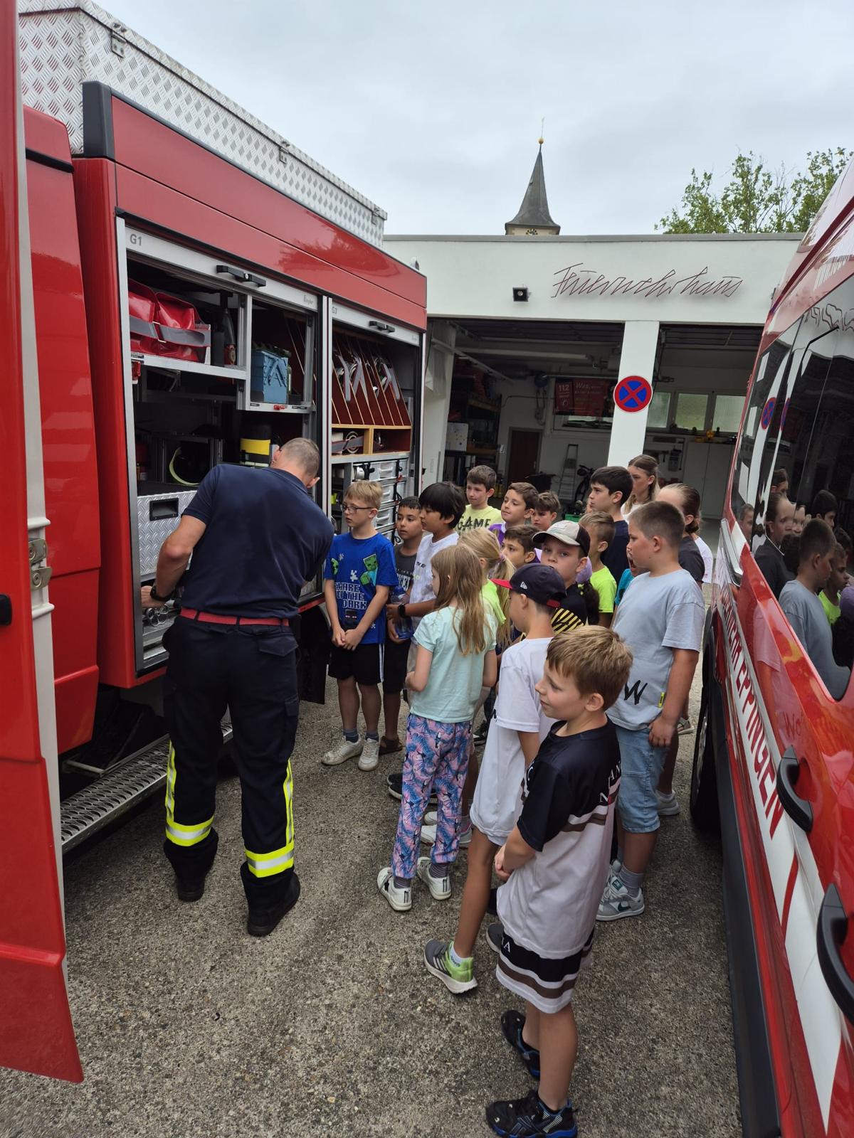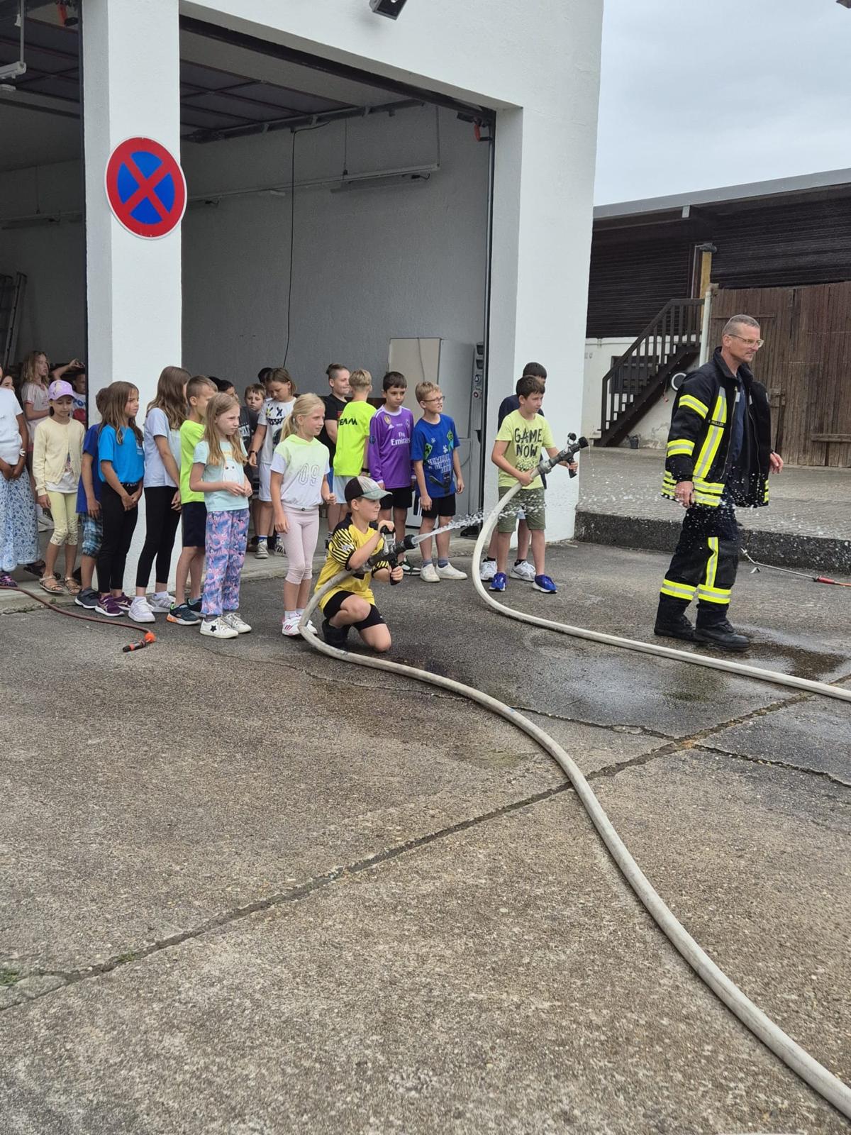 Am vergangenen Donnerstag besuchten die Dritt- und Viertklässler die Freiwillige Feuerwehr. Dort angekommen, hielt der Feuerwehrkommandant Samuel Müller einen