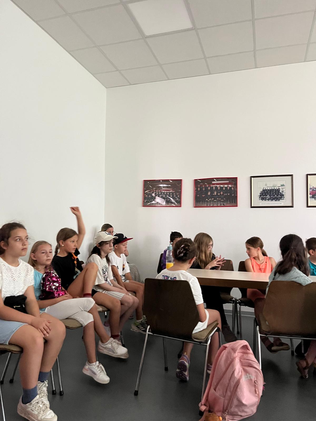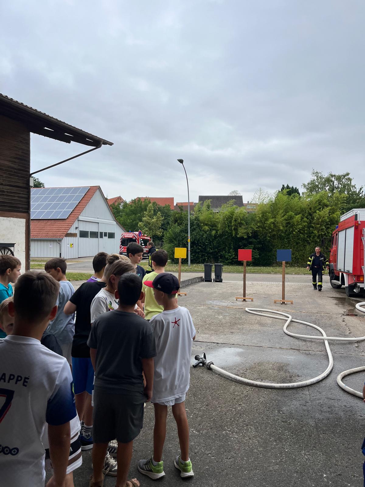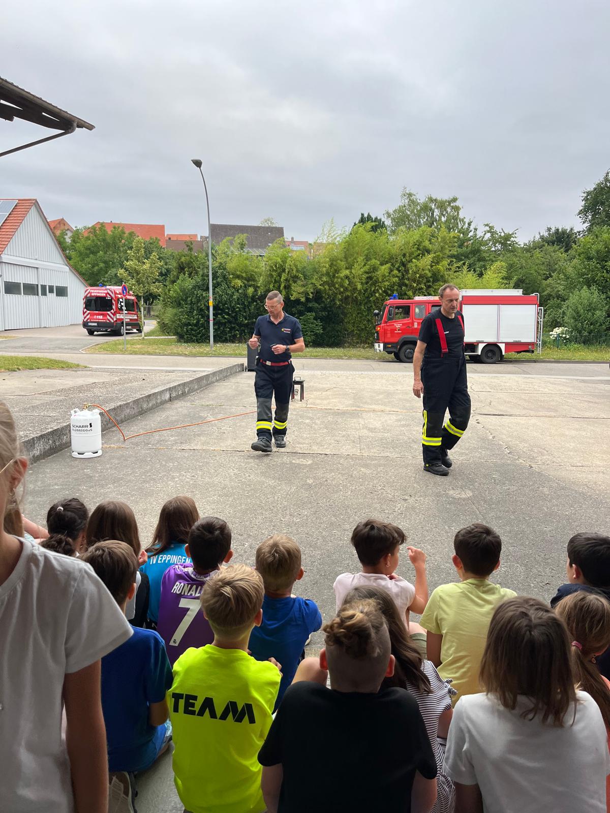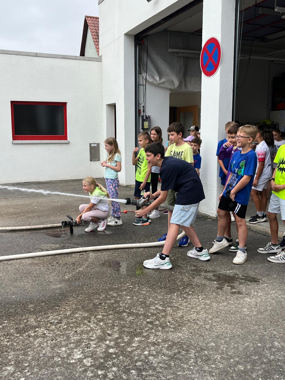 Am vergangenen Donnerstag besuchten die Dritt- und Viertklässler die Freiwillige Feuerwehr. Dort angekommen, hielt der Feuerwehrkommandant Samuel Müller einen