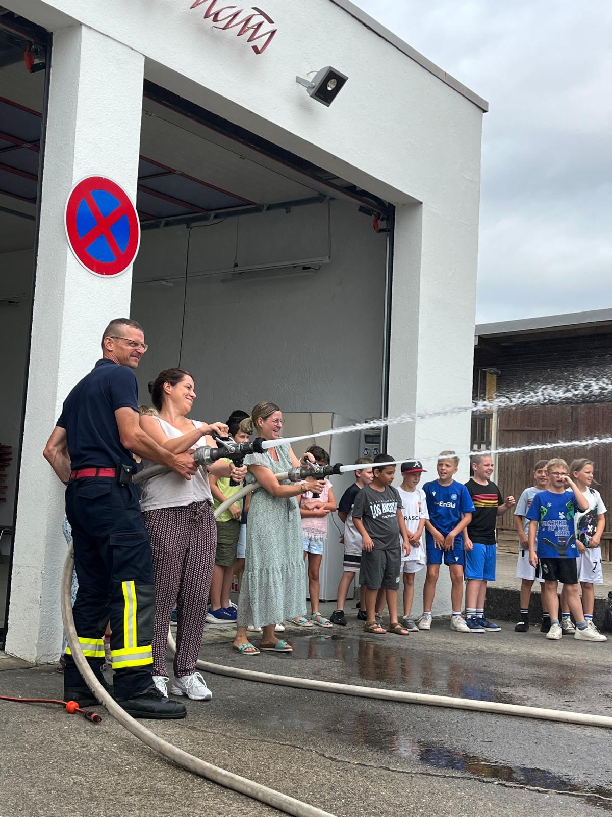 Zum Schluss durften alle probieren, mit dem Wasserschlauch Zielscheiben umzuschießen. Das hat allen Spaß gemacht, auch unseren Lehrerinnen.