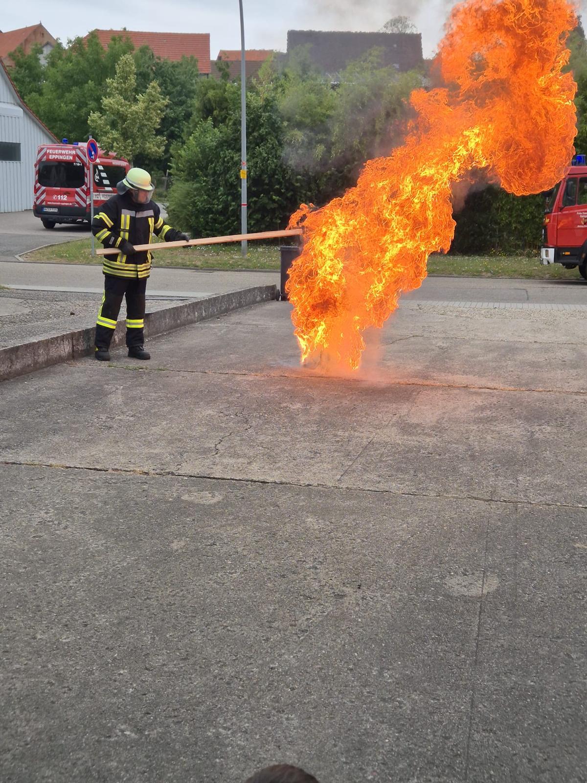 schwere Ausrüstung hochzuheben. Danach präsentierten uns Samuel Müller und Jörg Heitlinger ihre zwei Feuerwehrautos und deren Inhalt. Nun demonstrierten sie, was passiert, wenn man einen Ölbrand mit Wasser löscht. Die Stichflamme war so groß, dass wir die Hitze deutlich spüren konnten.
