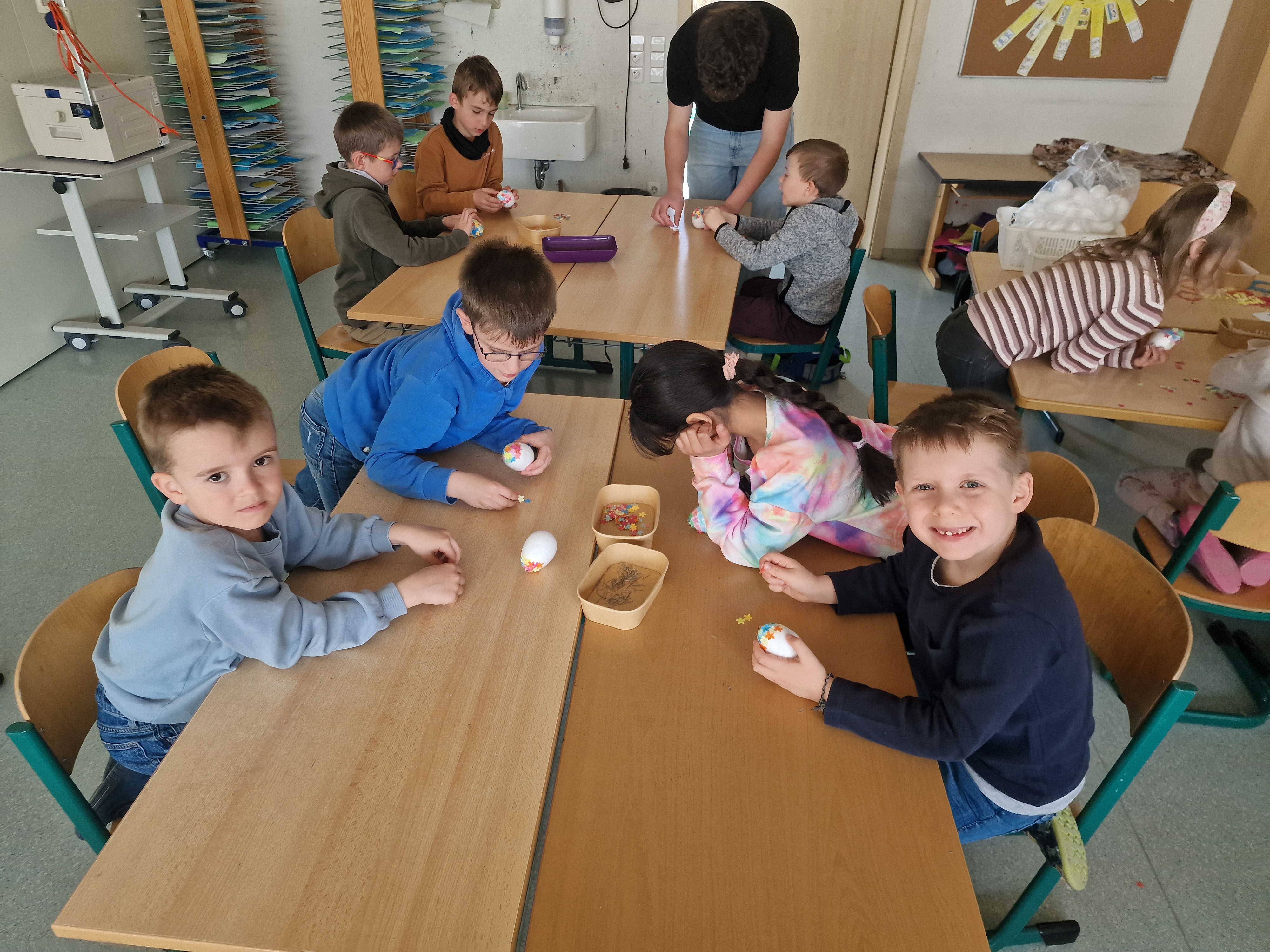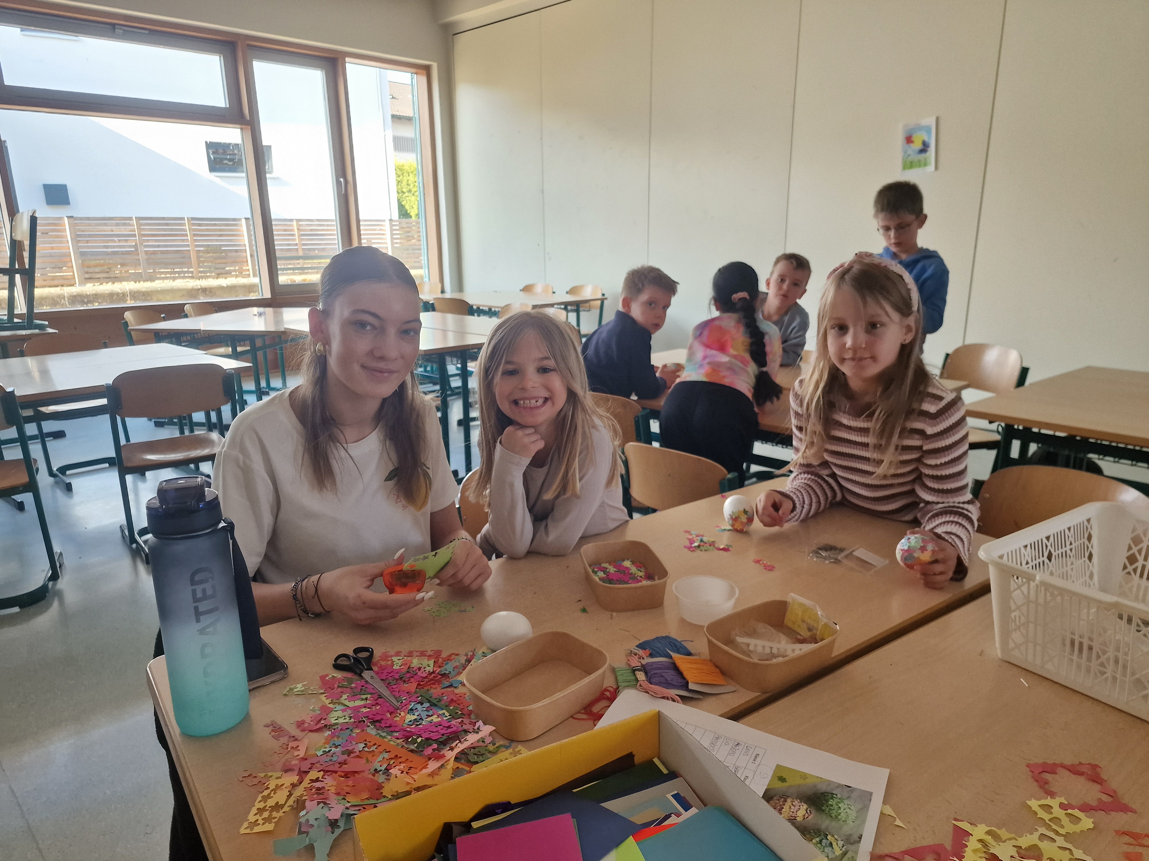 Jedes Kind durfte sich vorab für eine Station entscheiden: ob Hase, Ostereier, Schmetterlinge oder Windspiel - für jeden Geschmack war etwas dabei. Während die Kleinen mit viel Eifer bastelten, durchliefen die Dritt- und Viertklässler eine lustige Oster-Rallye auf dem gesamten Schulhof. Sie lösten Rätsel und meisterten Herausforderungen rund ums Thema Ostern. Nach der Pause wurde gewechselt, sodass alle Kinder an beiden Aktionen teilnehmen konnten.