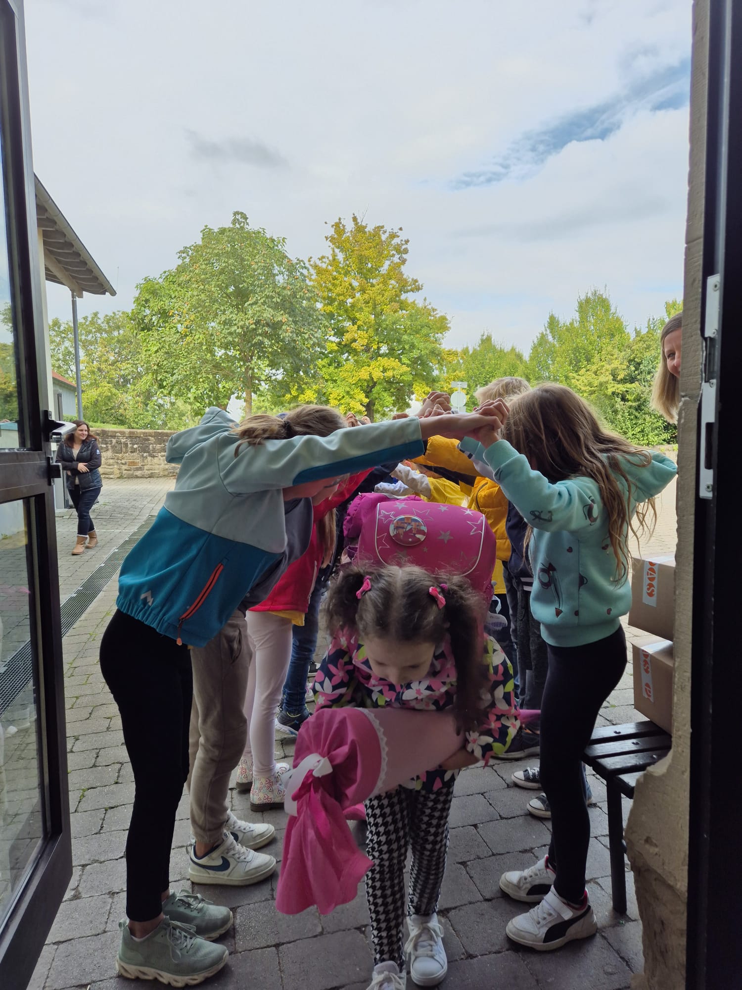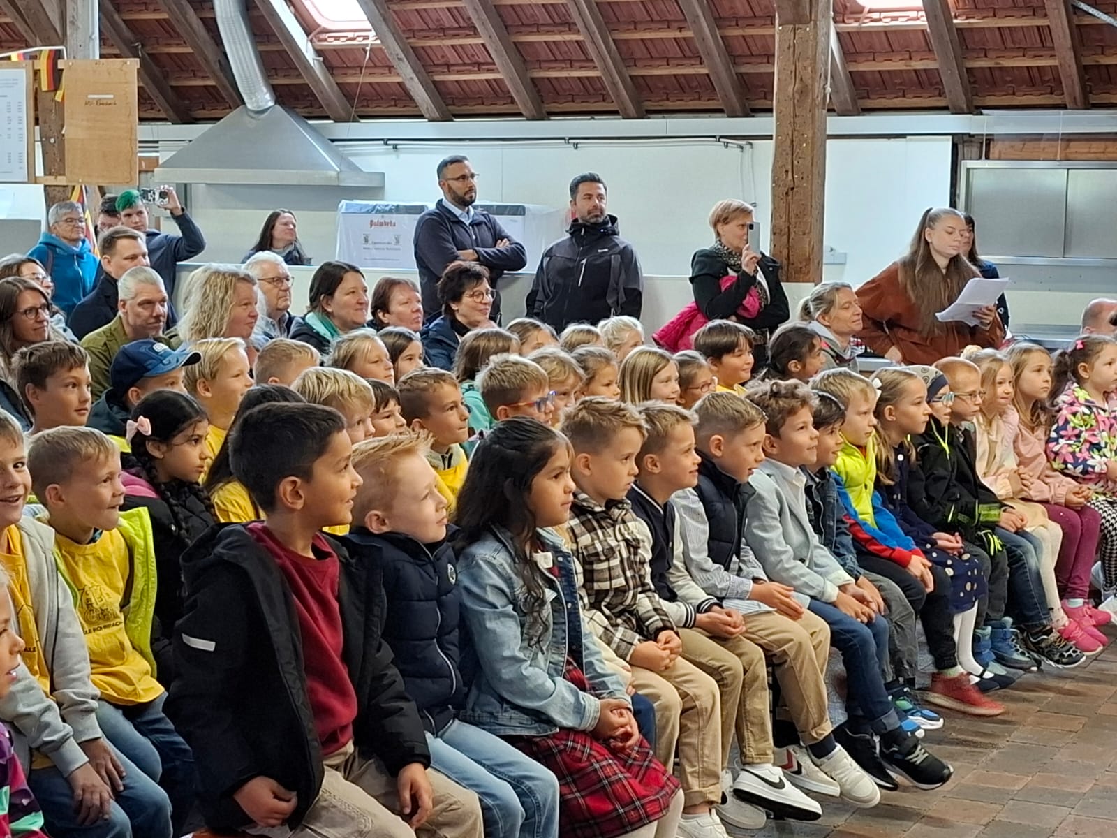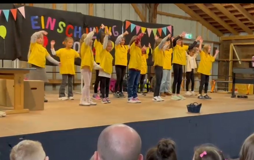 Mit dem bekannten Schüler-Boogie wurde die offizielle Feier beendet und die Erstklässler wurden von ihren Paten nach draußen geführt. Gemeinsam mit ihrer Klassenlehrerin liefen sie dann zur Schule, wo sie in ihrem Klassenzimmer endlich ihre erste Unterrichtsstunde erleben durften. Währenddessen wurden die zahlreichen Gäste von den Viertklässlern bewirtet, bis sie ihre Kinder vor dem Schulhaus wieder in Empfang nehmen konnten. Wir wünschen allen einen guten Start in den Schulalltag!