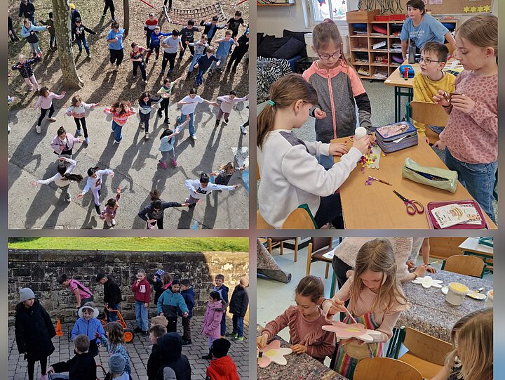 verschiedene Projekte, bei denen Kreativität, Bewegung und gemeinsames Erleben im Mittelpunkt standen. Im Bastelprojekt entstanden dekorative Osterkarten und bunte Küken. Mit großer Freude bemalten die Kinder außerdem bunte Holzblumen, die am Schulzaun befestigt werden und so bald das Schulgelände schmücken. Für viel Bewegung und gute Laune sorgten die Wettspiele auf dem Schulhof. Etwas ruhiger ging es beim Zuhören einer lustigen Geschichte zu. Mit viel Aufmerksamkeit und Freude verfolgten die Kinder die unterhaltsame Erzählung und konnten dabei entspannen und gemeinsam lachen. In der großen Pause tanzten die Kinder außerdem einen Flashmob, den sie in den vergangenen Wochen fleißig eingeübt hatten. Zum Abschluss versammelten sich alle Klassen, um gemeinsam einen Frühlingskanon zu singen. Dieser stimmungsvolle Moment bildete den Auftakt für den krönenden Abschluss: die Osternestsuche auf dem Schulhof. Mit leuchtenden Augen machten sich die Kinder auf die Suche nach den versteckten Nestern und freuten sich über die gelungene Überraschung. So starteten alle gut gelaunt in die Osterferien.