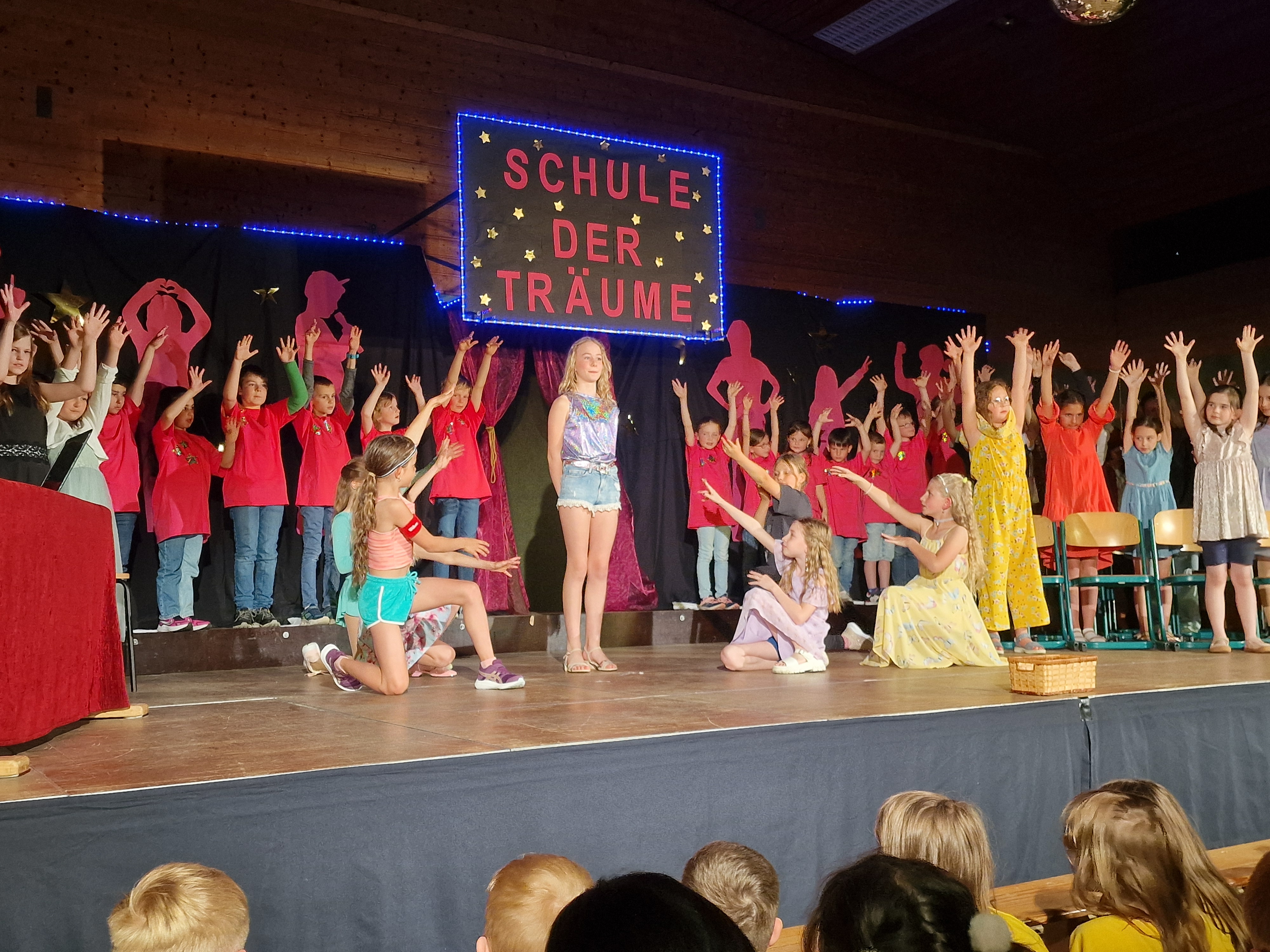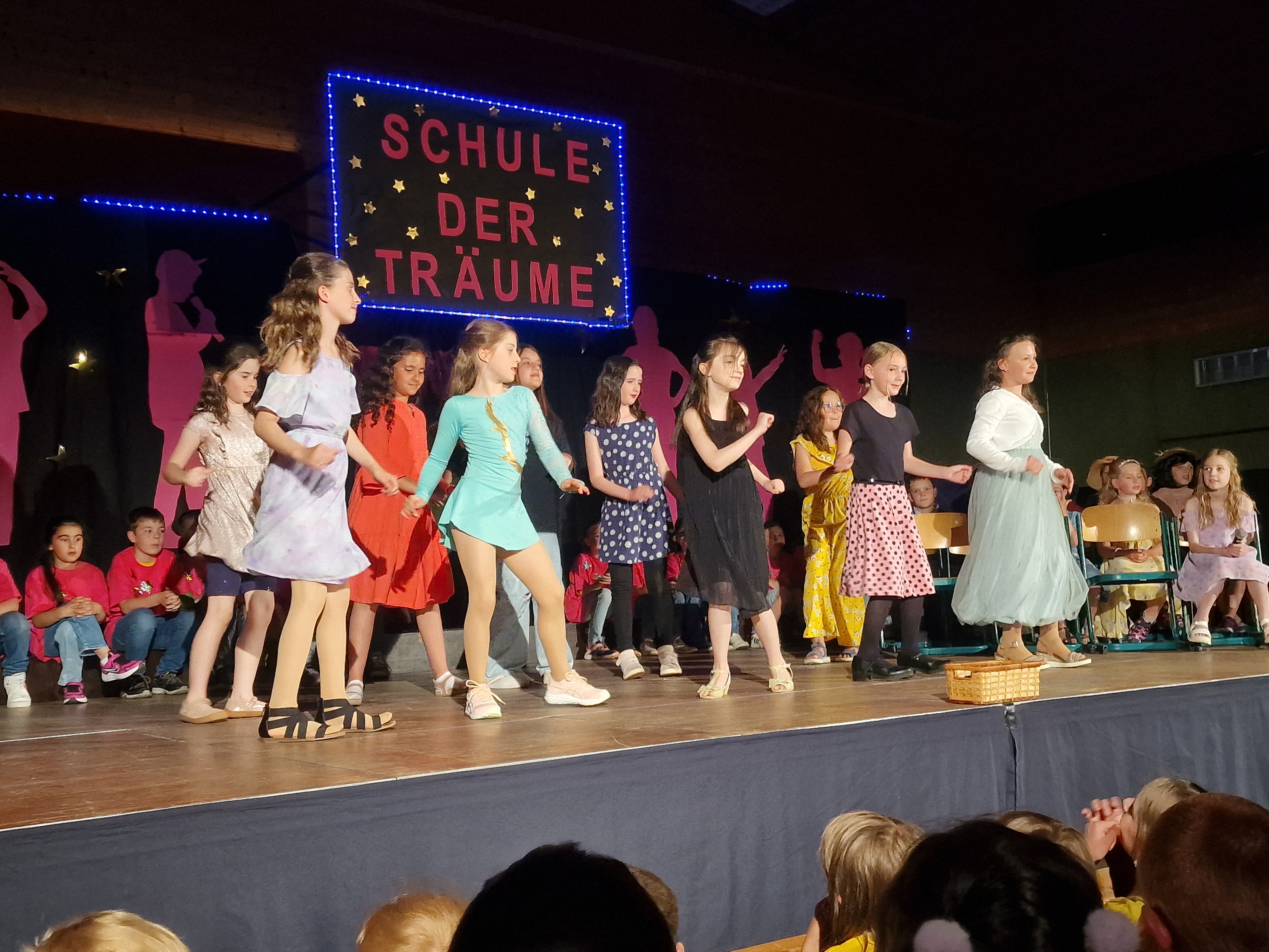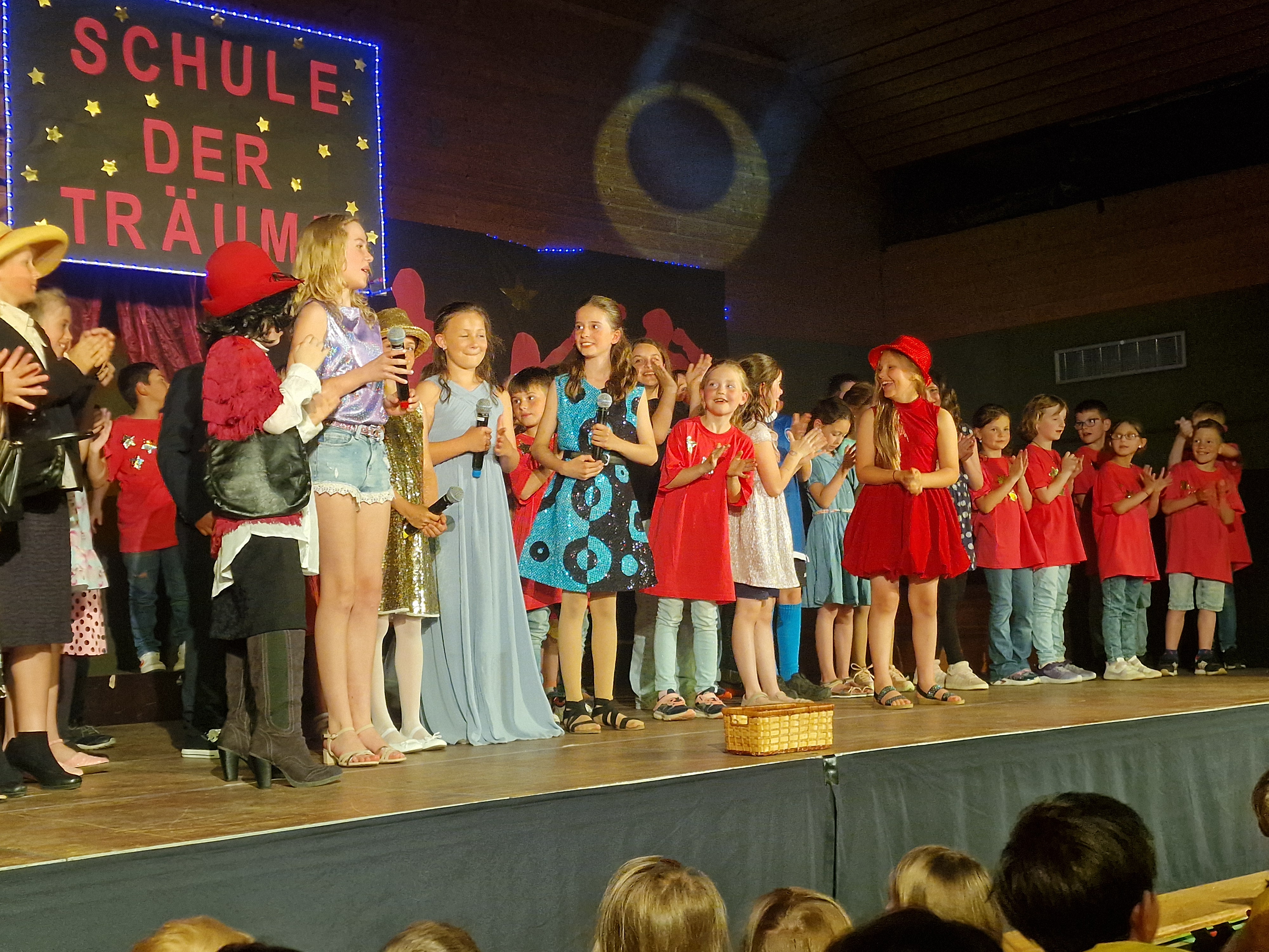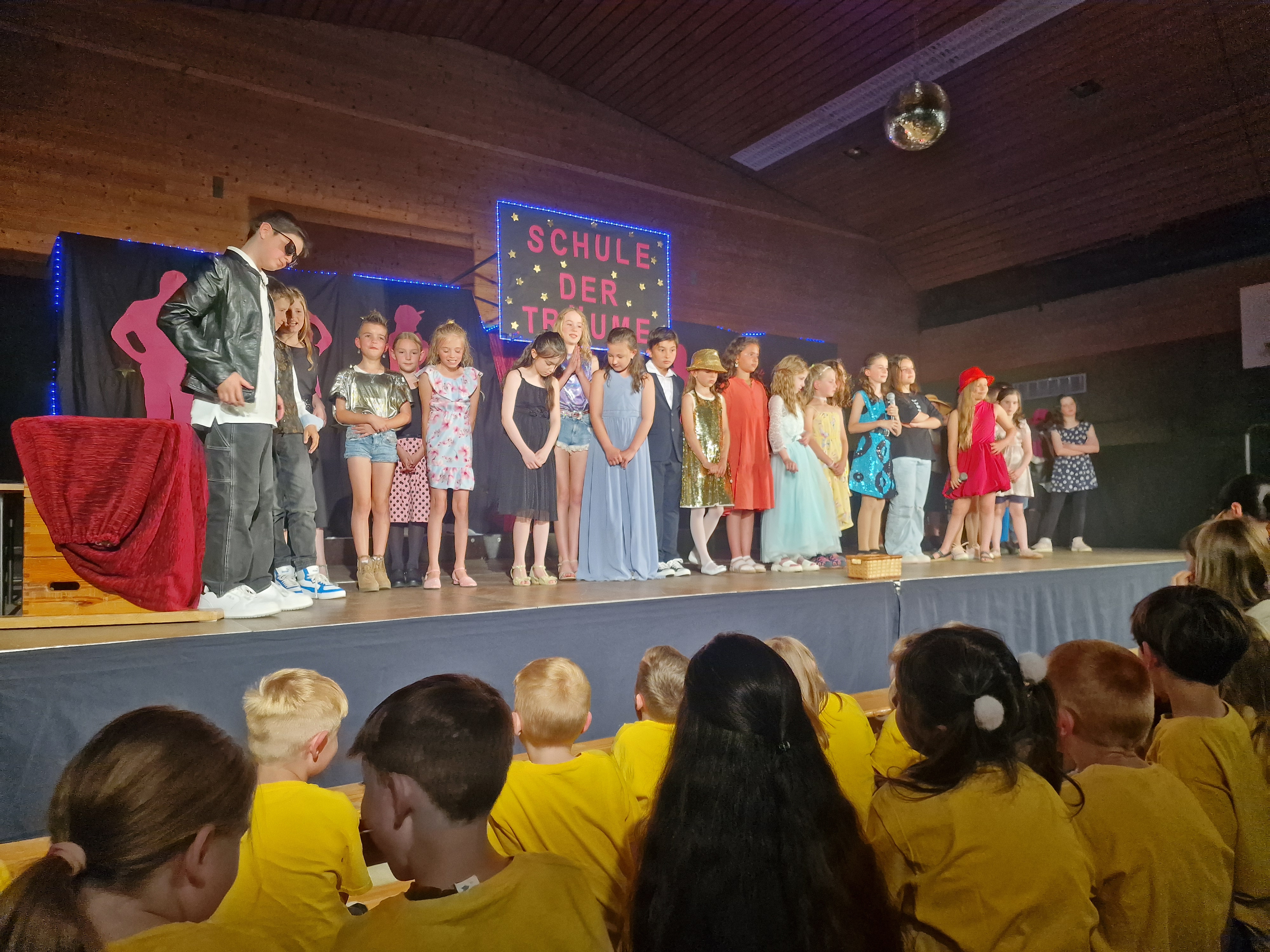 Jahrzehnte. Wieder mit Live-Musik vom Kollegium begleitet und von der Schulleiterin dirigiert, präsentierten sie ein Medley aus ausgewählten Liedern vergangener Musicals und sorgten damit für Gänsehautmomente – nicht nur bei den Lehrkräften, sondern auch bei den zahlreich erschienenen Eltern, Großeltern und Freunden der Schule. Frau Gern freute sich sehr über die vielen Ehemaligen, die sich für dieses Projekt die Zeit genommen haben und schöne Erinnerungen an die Grundschulzeit aufleben ließen.