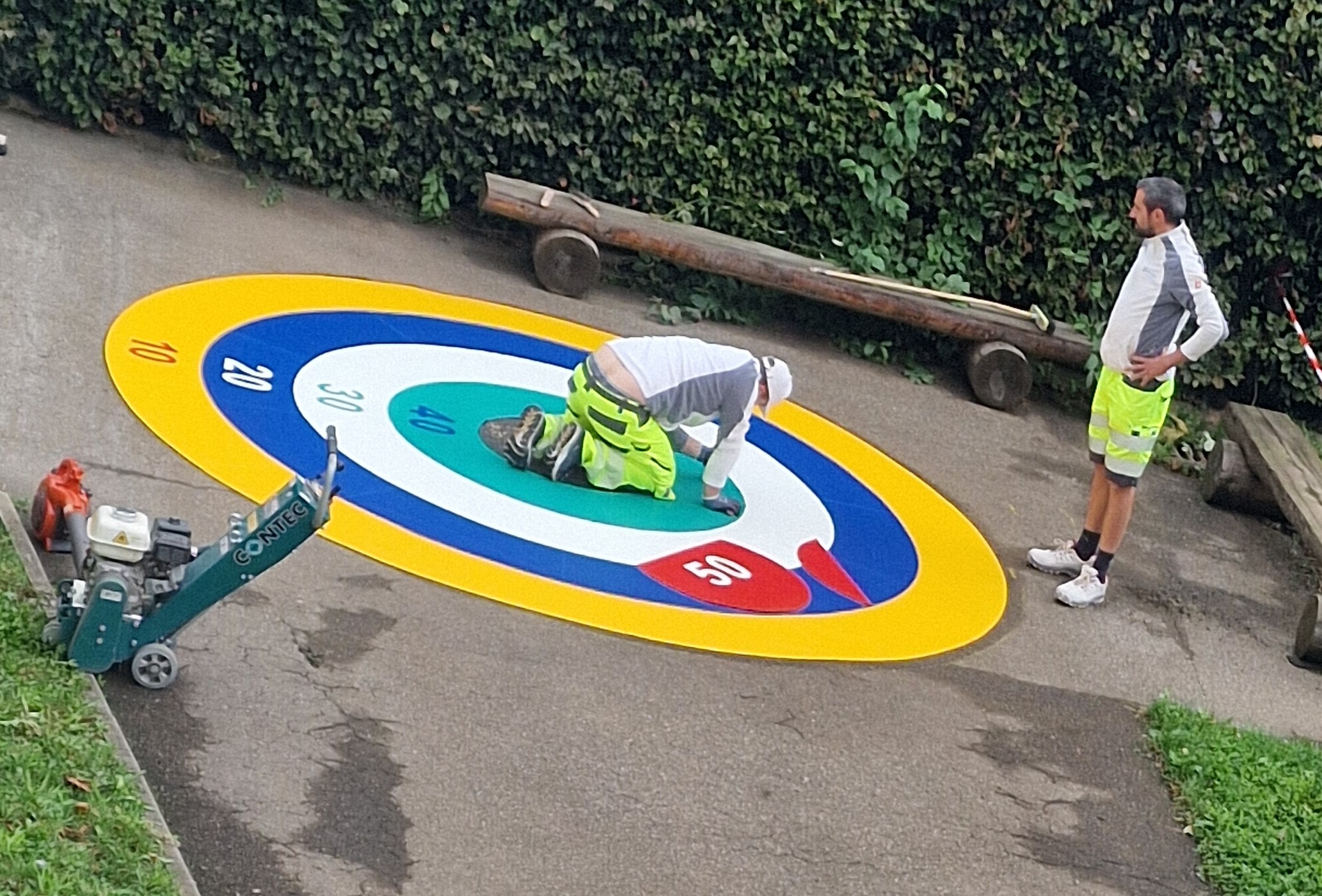 In der ersten Schulwoche kamen dann die Mitarbeiter Rafael, Tim und Sebastian zur Grundschule, um diese Hüpfspiele auf dem Schulhof aufzubringen. Als erster Schritt erfolgte das Absperren der Arbeitsbereiche, um die Sicherheit der Schüler während der Arbeiten zu gewährleisten. Anschließend wurde eine alte Zeichnung mit einer Oberflächenfräse entfernt, um die Fläche für die neuen Piktogramme vorzubereiten.