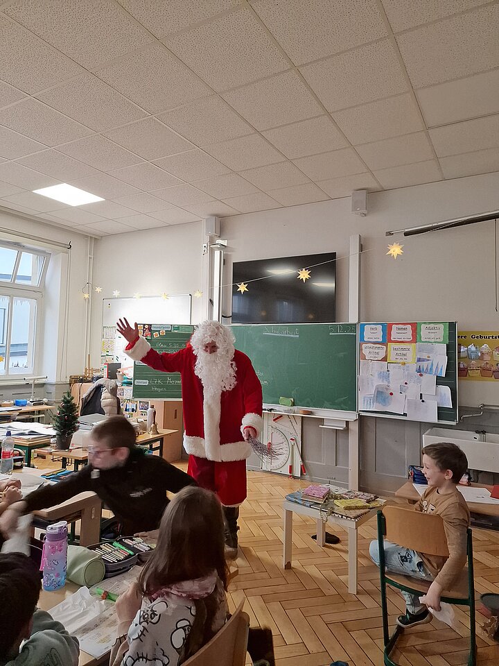 Mit lautem Geläut seiner Glocke hat der Nikolaus die Grundschule Rohrbach am Tag vor Nikolaus in festliche Stimmung versetzt. Mit polternden Schritten trat er ins Schulhaus und machte sich auf den Weg von Klasse zu Klasse, um die Kinder persönlich zu begrüßen.