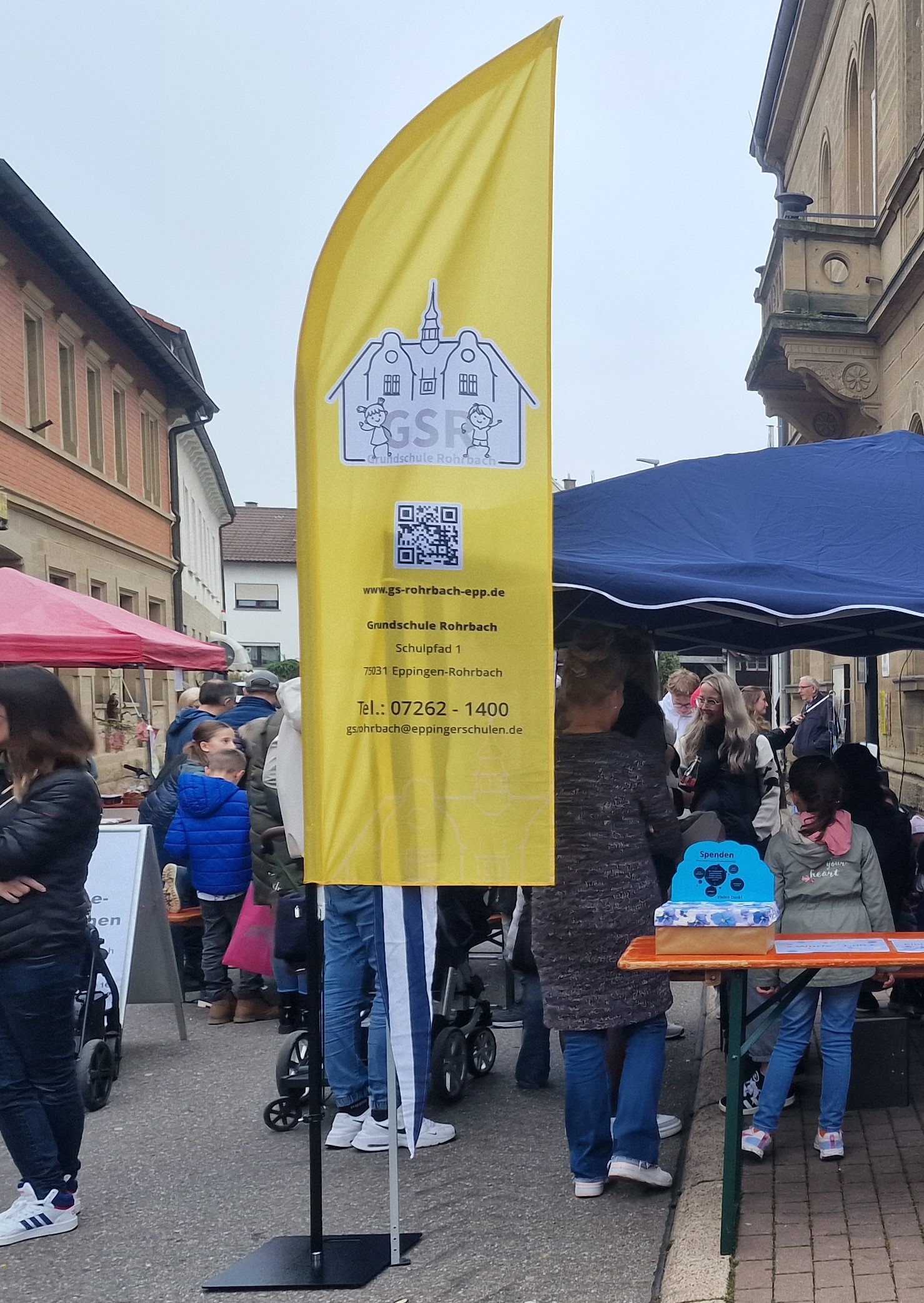 Pünktlich zur Kerwe konnte außerdem unsere neue Flagge mit dem Logo der Grundschule Rohrbach auf der Kerwe präsentiert werden. Diese wurde von Pascal Mühlich und seiner Firma "Müller klebt" hergestellt und gesponsert. Die Flagge war ein echter Blickfang und machte den Stand der Grundschule schon