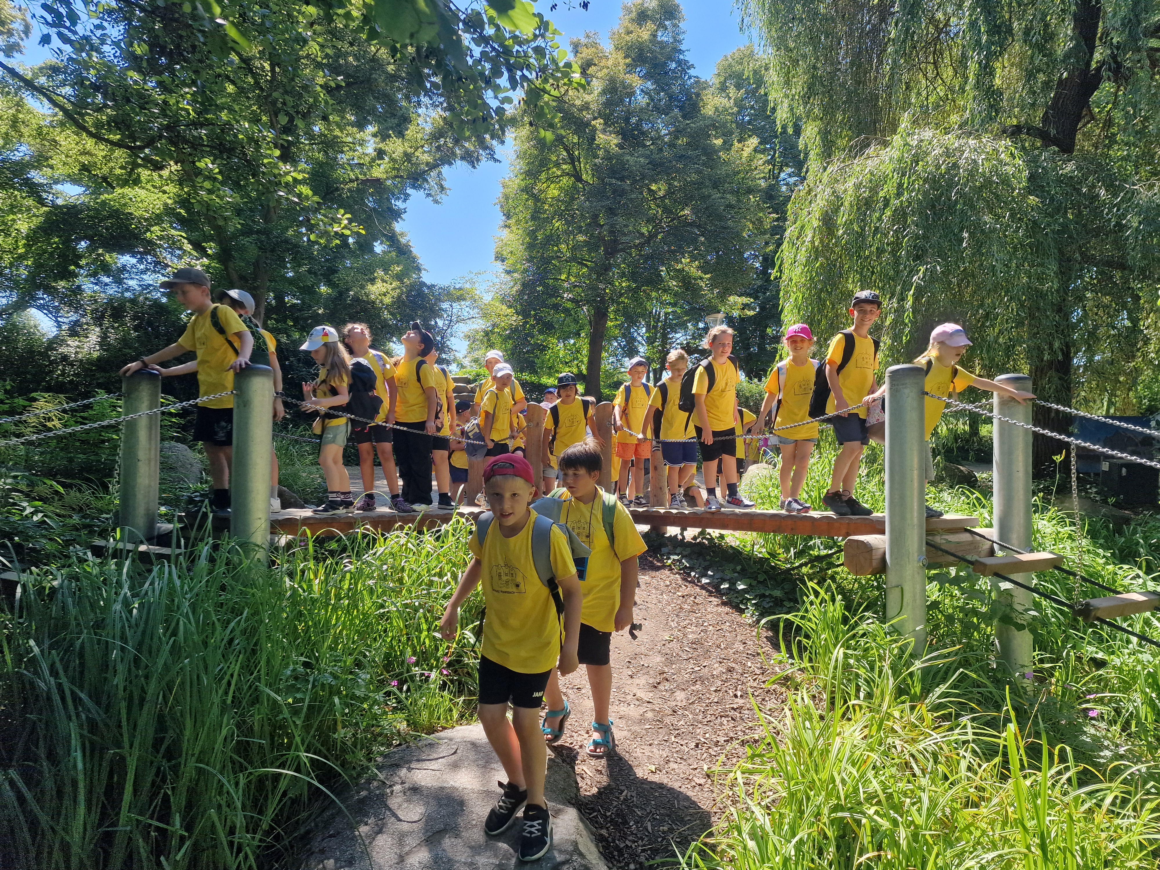 Da alle Kinder ihre gelben Schul-T-Shirts trugen, konnte die große Gruppe problemlos zusammengehalten werden und das Zugehörigkeitsgefühl, das durch den Ausflug mit der ganzen Schule gestärkt wird, kam so auch äußerlich zum Ausdruck. Vielen Dank an den Förderverein, der den tollen Ausflug bezuschusst hat.