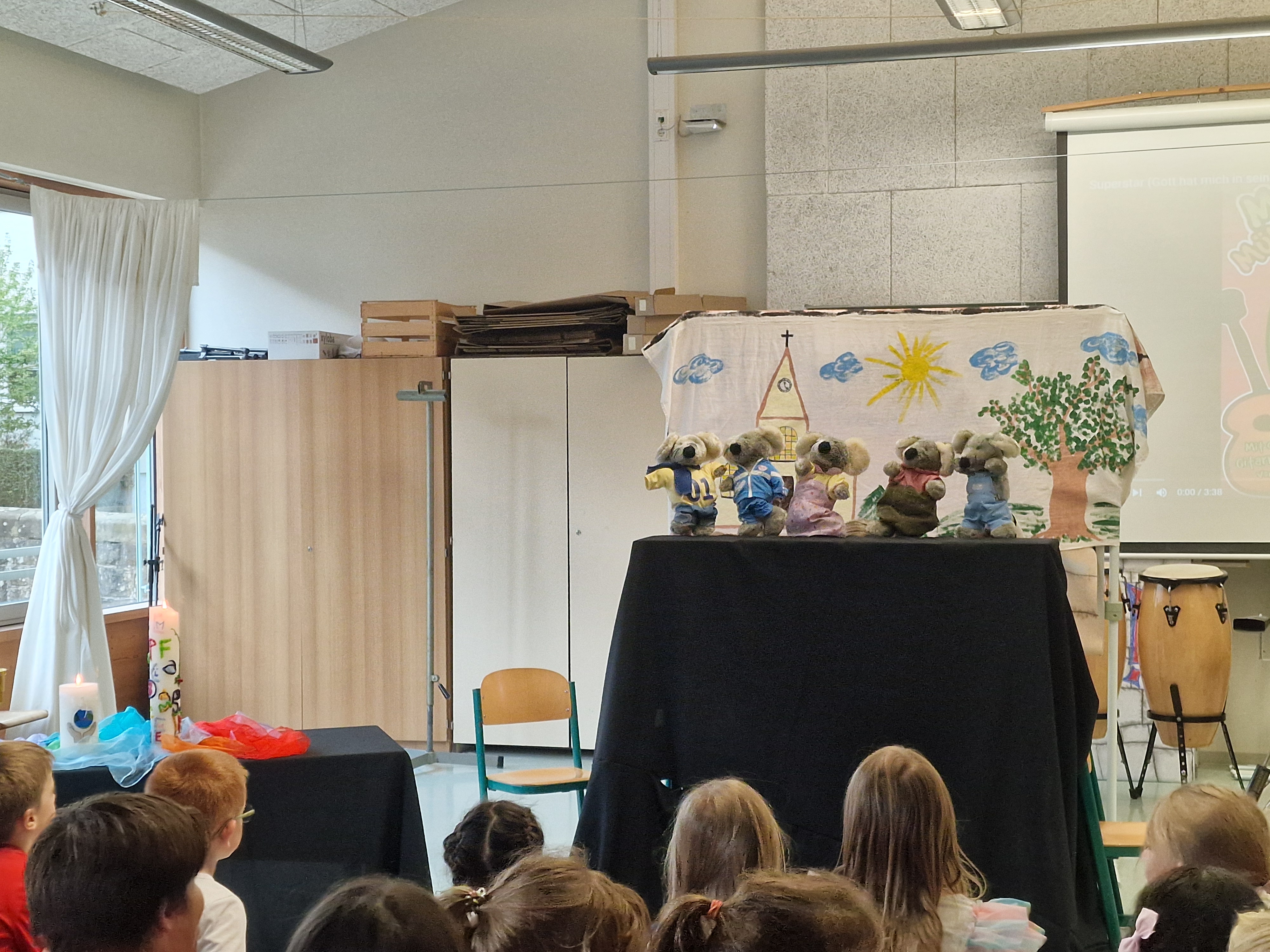 Ein Höhepunkt der Andacht war das Puppenspiel „Die Mutprobe“, das die Religionslehrerinnen einstudiert hatten. Das Stück basiert auf dem Hörspielklassiker Christopher Kirchenmaus und wurde von den Viertklässlern mit viel Freude gelesen. Die Geschichte erzählt von Mut und Freundschaft und bot den Kindern wertvolle Impulse, über diese wichtigen Themen nachzudenken.